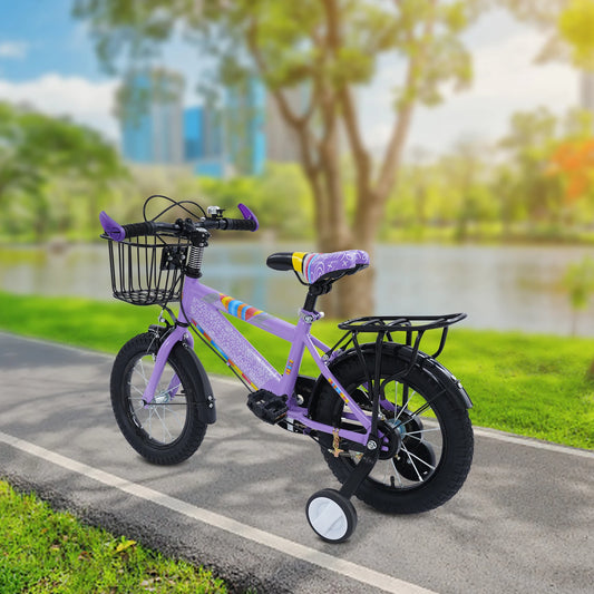 14-Zoll-Kinderfahrrad, verstellbarer Sitz, Kinderfahrradlast 50 kg, mit Trainingsrädern + Korb + Rücksitz für 3–6 Jahre alt (lila/rosa)