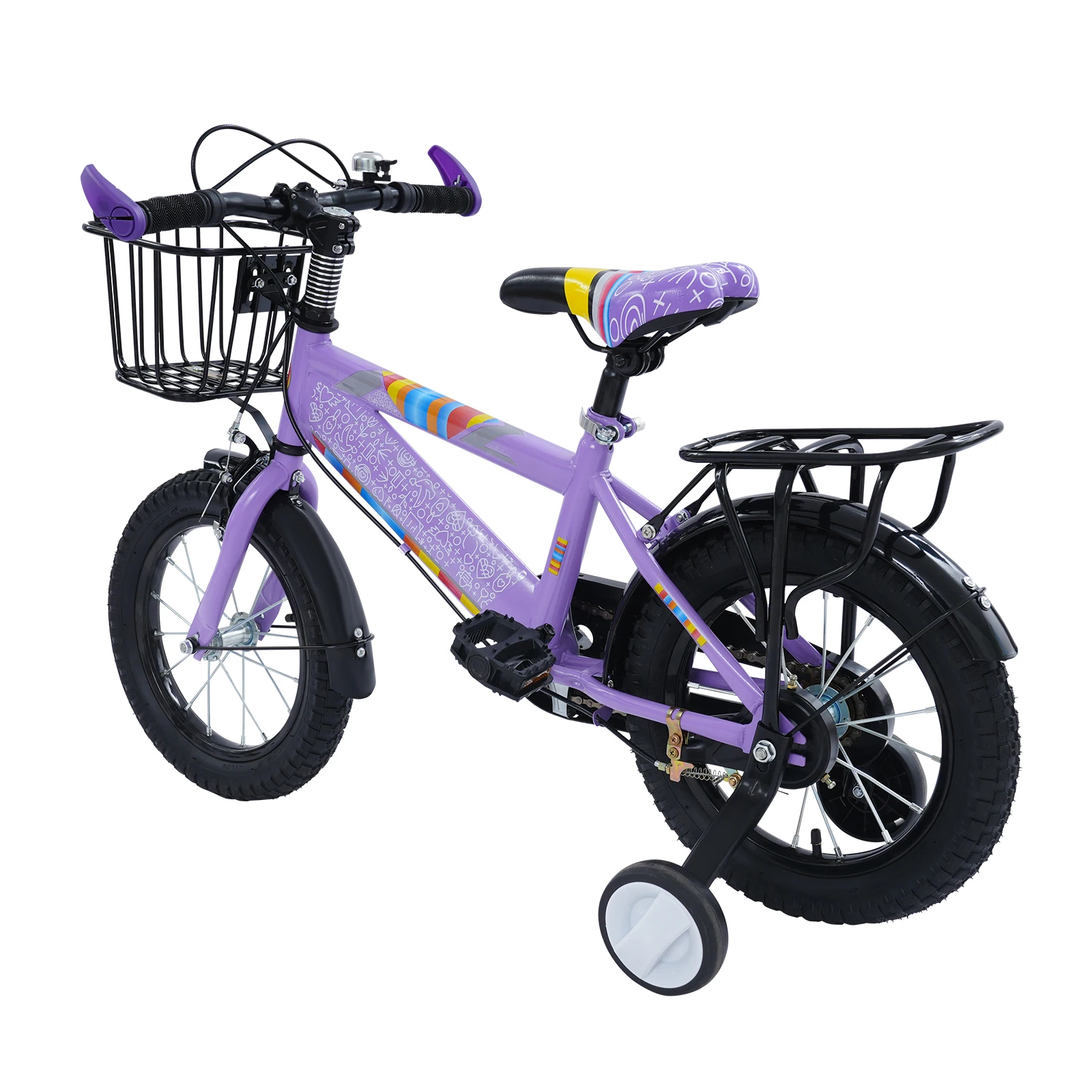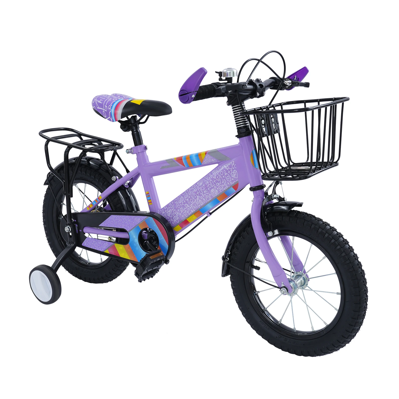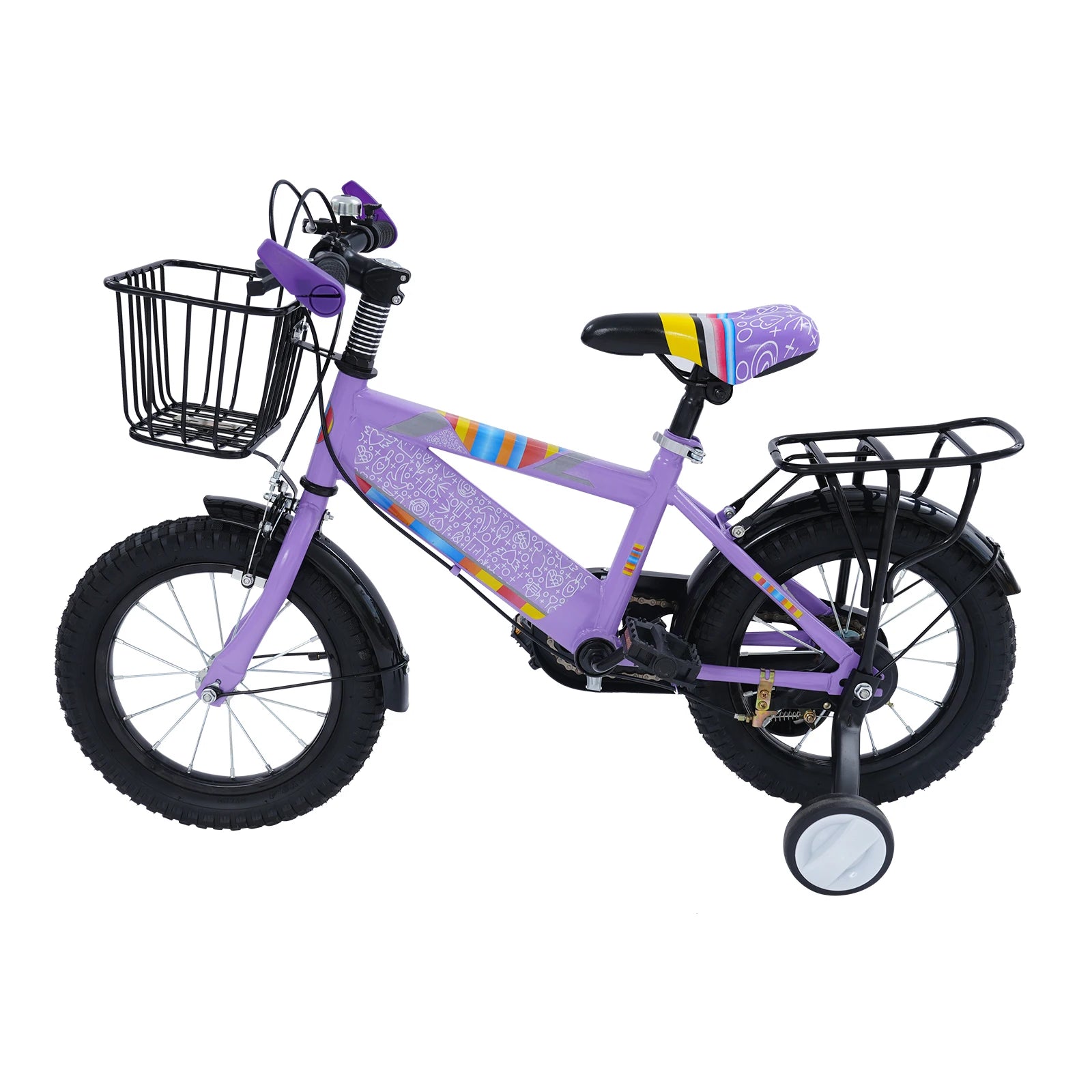14-Zoll-Kinderfahrrad mit Trainingsrädern und verstellbarem Sitz – robustes Kinderfahrrad mit Kohlenstoffstahlrahmen, 50 kg/110 lb Tragfähigkeit, Kinderfahrrad mit Sicherheitskettenabdeckung + Gepäckstangen-Rücksitz + Glocke + Aufbewahrungskorb für 3–6 Jahre alte Jungen Mädchen| Einfache Montage und rutschfeste Reifen (Lila/Rosa)