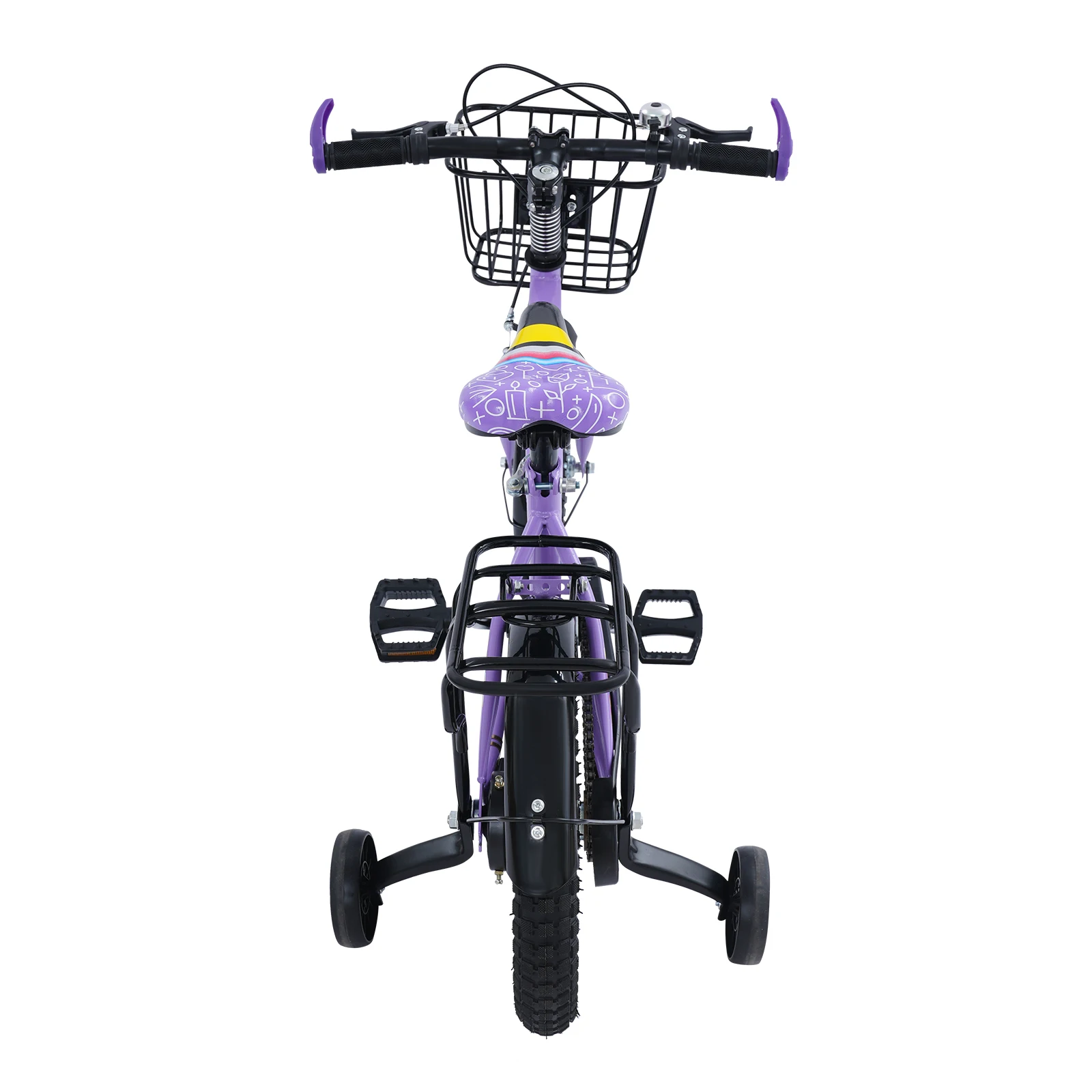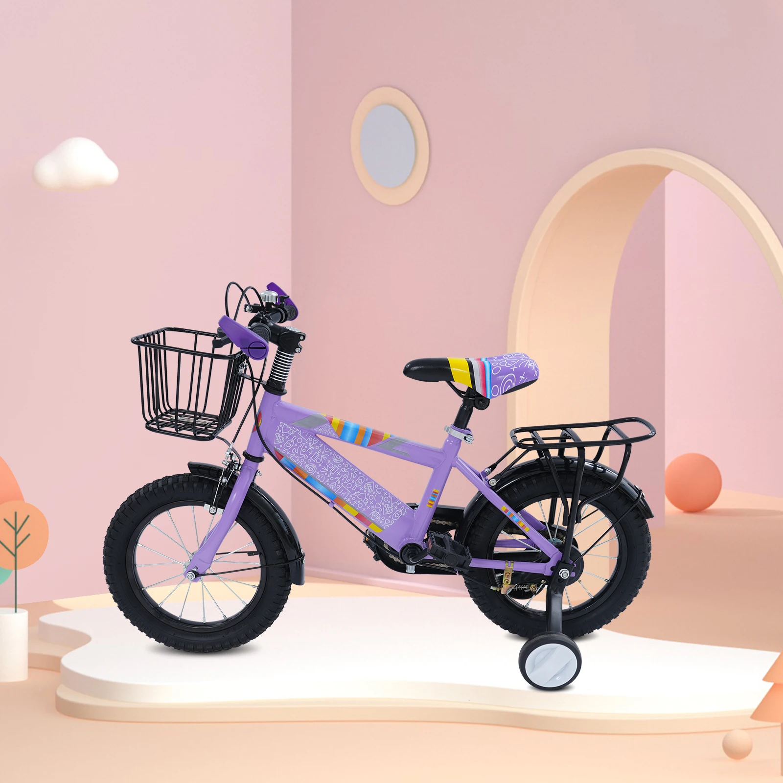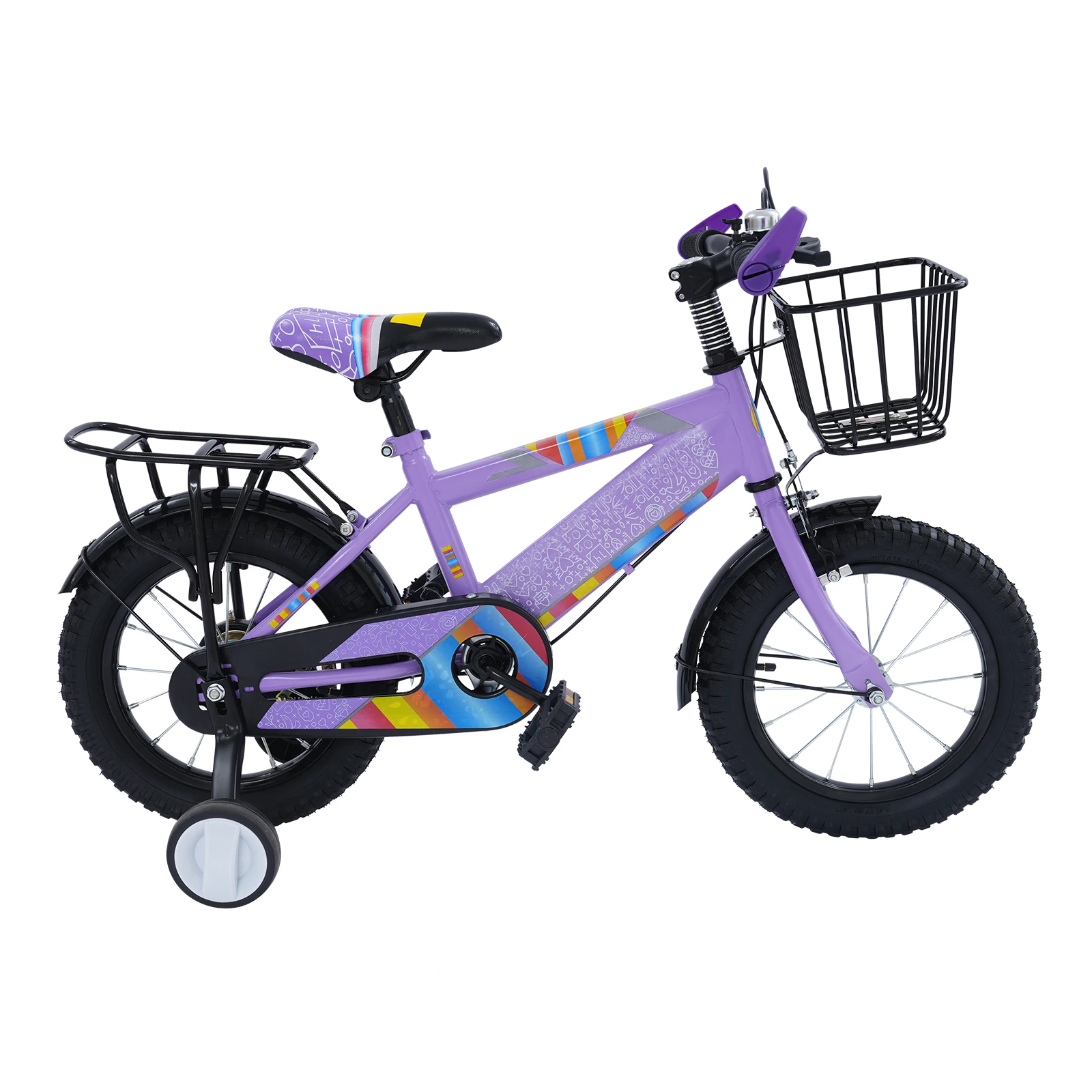 14-Zoll-Kinderfahrrad mit Trainingsrädern und verstellbarem Sitz – robustes Kinderfahrrad mit Kohlenstoffstahlrahmen, 50 kg/110 lb Tragfähigkeit, Kinderfahrrad mit Sicherheitskettenabdeckung + Gepäckstangen-Rücksitz + Glocke + Aufbewahrungskorb für 3–6 Jahre alte Jungen Mädchen| Einfache Montage und rutschfeste Reifen (Lila/Rosa)
