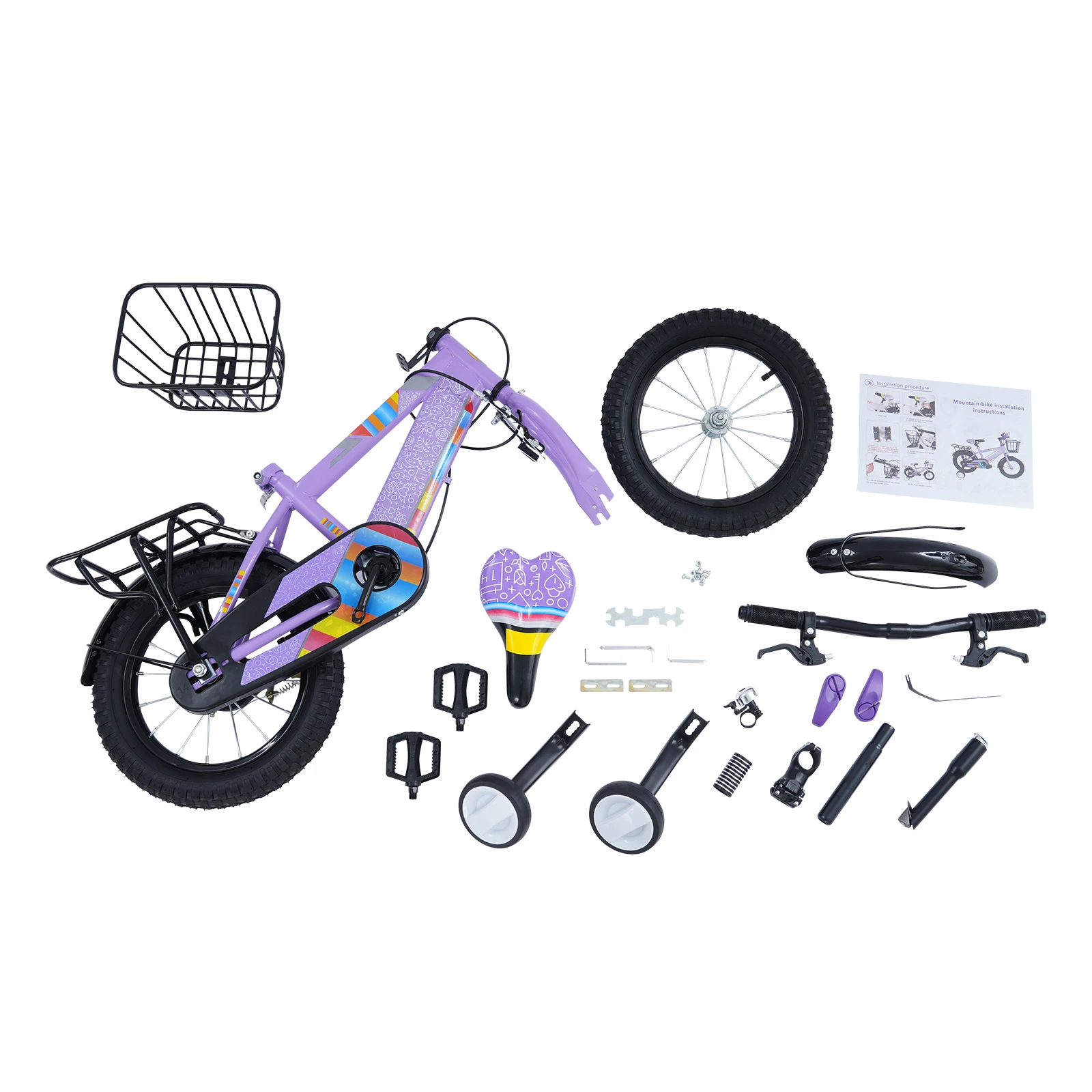 14-Zoll-Kinderfahrrad, verstellbarer Sitz, Kinderfahrradlast 50 kg, mit Trainingsrädern + Korb + Rücksitz für 3–6 Jahre alt (lila/rosa)
