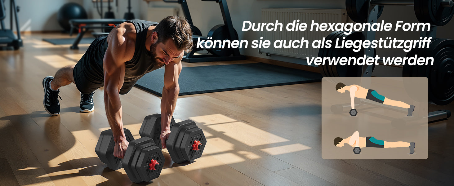 Vielseitig: Kann als Hantel, Langhantel oder sogar für Liegestütze verwendet werden, da sie durch ihre sechseckige Form nicht wegrollt – für jedes Trainingsbedürfnis geeignet