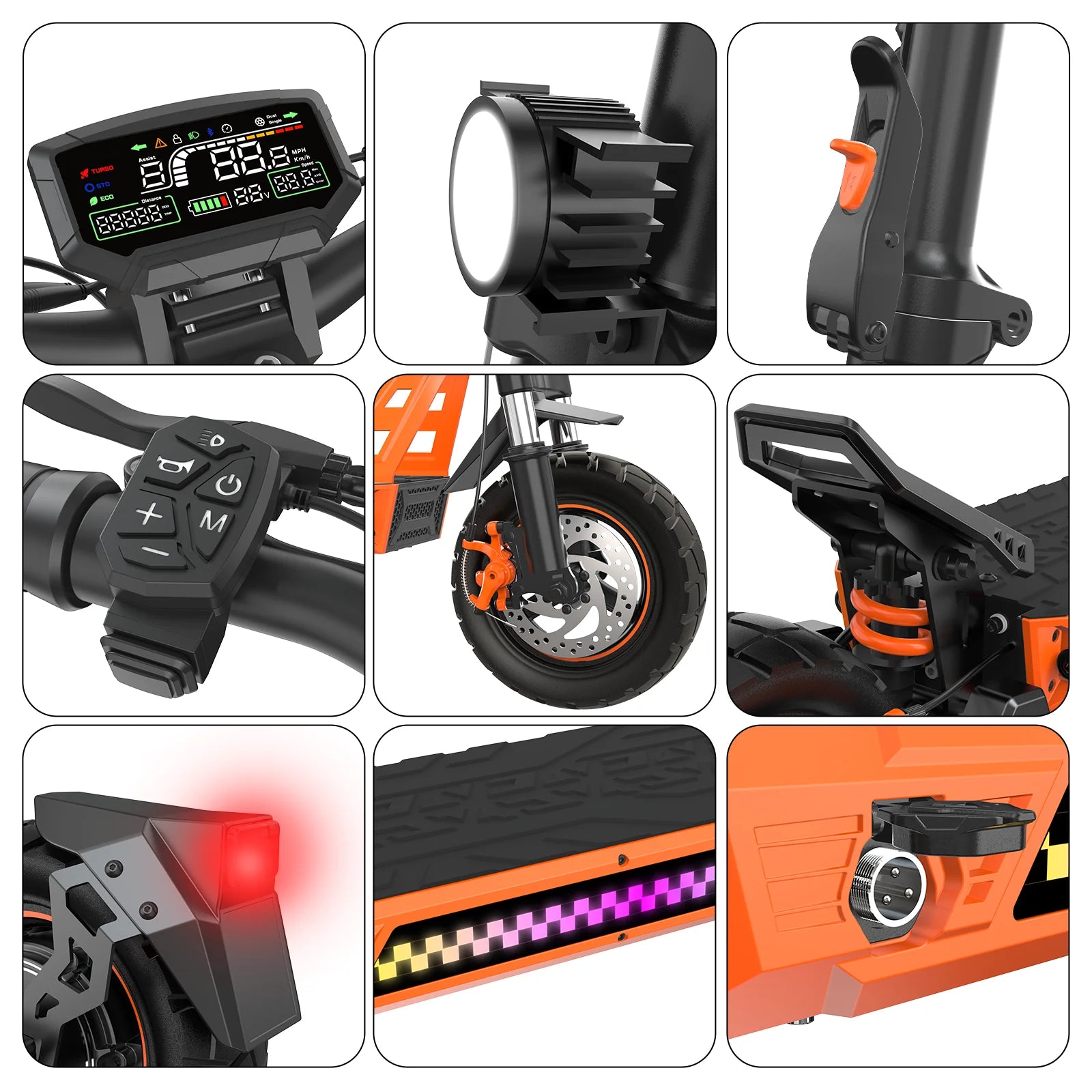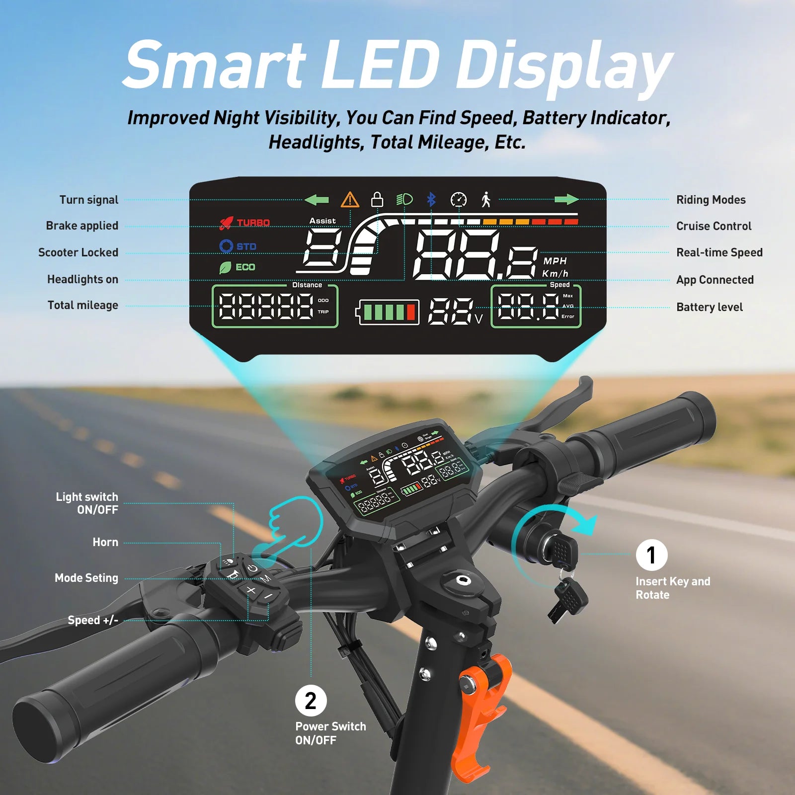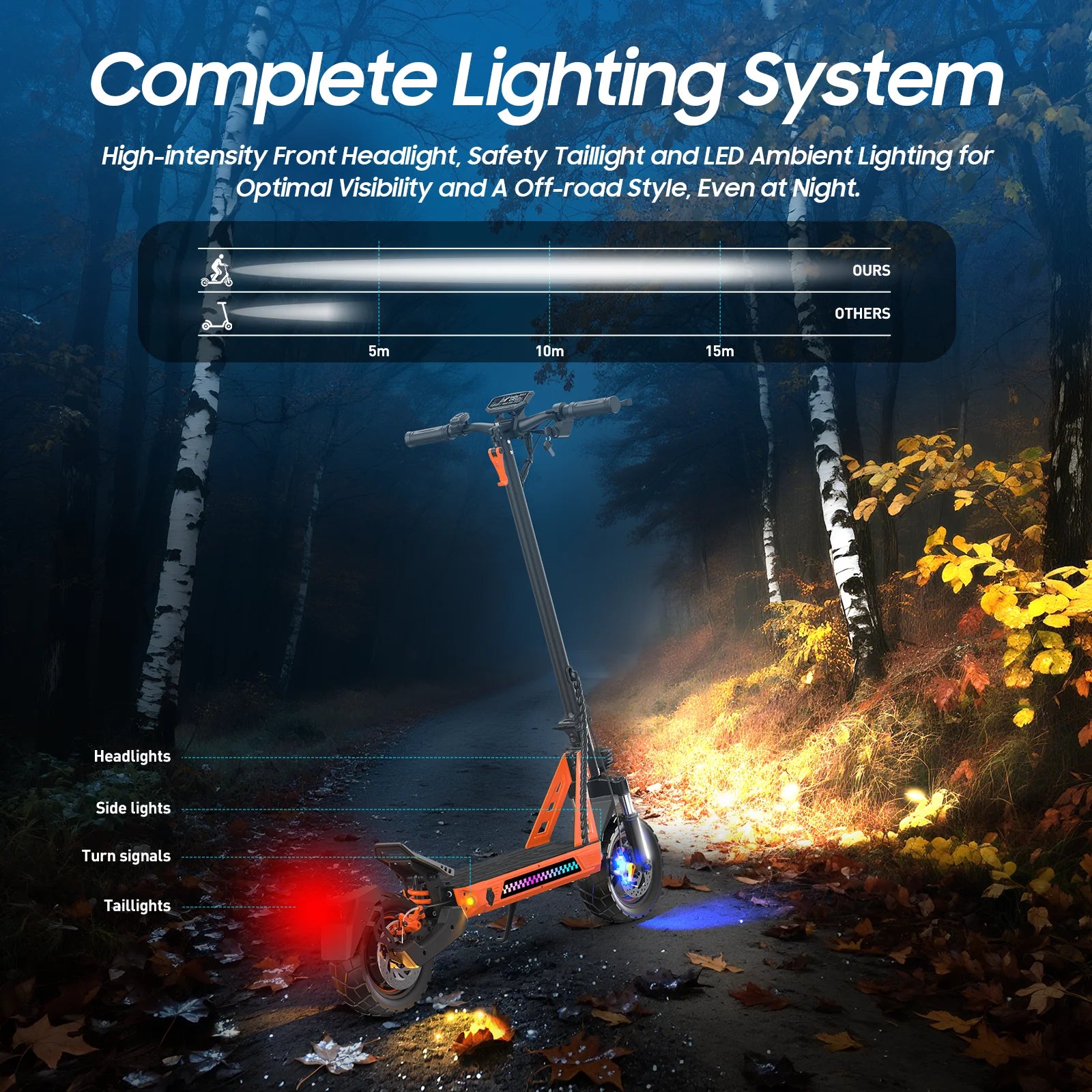 Wasserdichte LED-Lackierung, zwei ultraleichte Scheinwerfer und 4-Winkel-Blinklichter für gute Sicht bei Tag und Nacht.