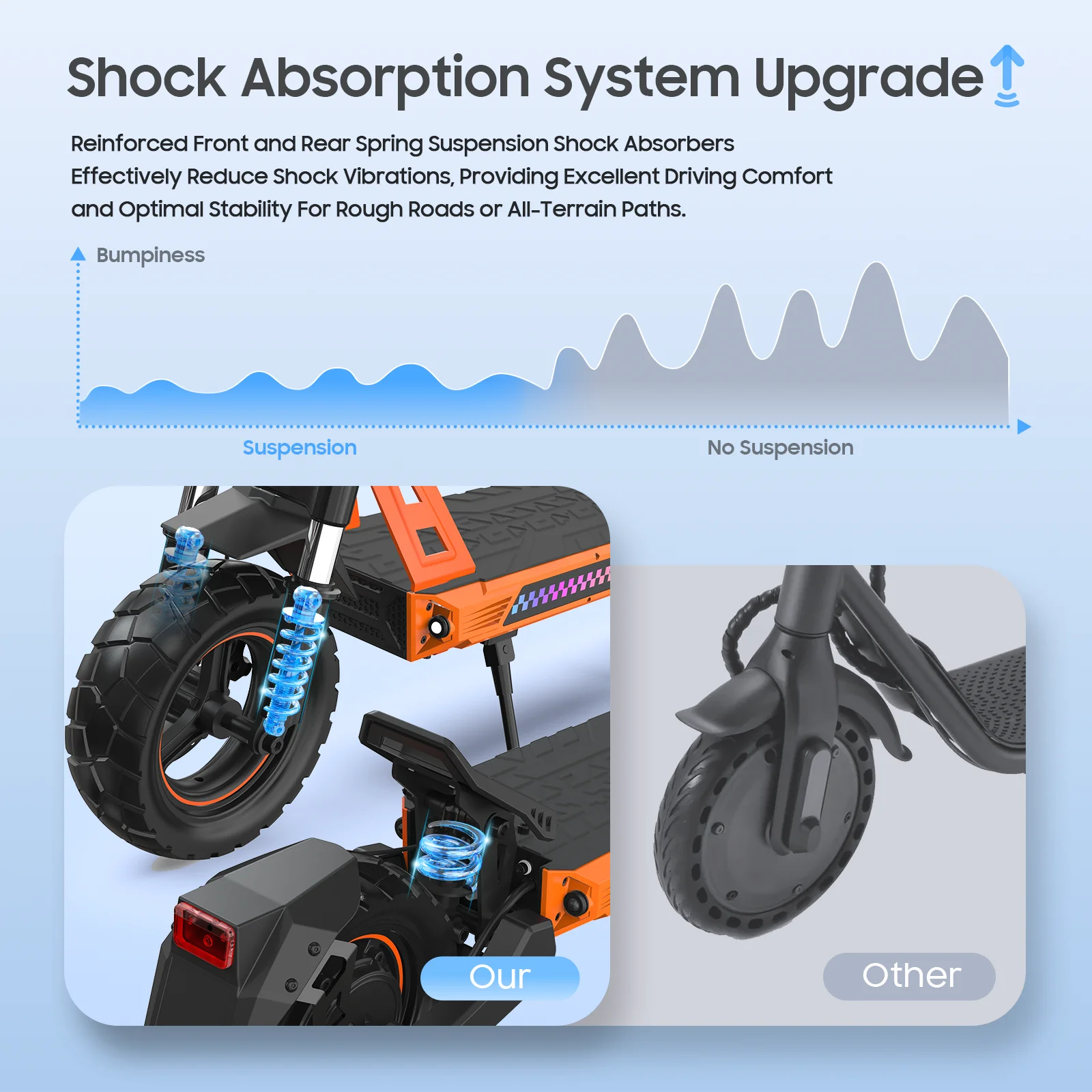 Verstärkte Vorder- und Hinterfeder-Stoßdämpfer reduzieren effektiv Stoßvibrationen und bieten hervorragenden Fahrkomfort und optimale Stabilität für raue Straßen oder All-Terrain-Wege.