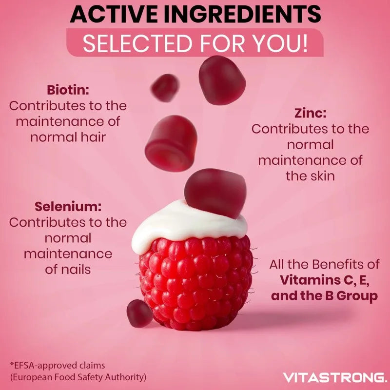 Vitastrong-Haar- und Nagelmüll sind mehr als nur Süßigkeiten – sie enthalten von innen für Ihre Schönheit ausgewählte Nährstoffe.Laut EFSA tragen Biotin, Zink und Selenium zur Erhaltung normaler Haare, Leder und Nägel bei.Vitamin C und Vitamin E schützen die Zellen vor oxidativem Stress, während Vitamin B6 und Folat zur Reduzierung von Müdigkeit beitragen.Darüber hinaus unterstützt Jod die normale Schilddrüsenfunktion und trägt so dazu bei, das Gleichgewicht im Körper aufrechtzuerhalten.