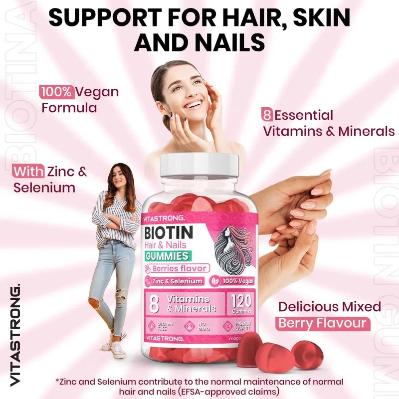 VEGANISCHE FORMEL OHNE SUGARS:Entdecken Sie unsere köstlichen Biotin-Gummis mit Beerengeschmack!Mit einer ausgewogenen Kombination aus Vitaminen für das Haar wie Vitamin C, Vitamin E, Vitamin B6, Folat und essentiellen Mineralien wie Zink, Selenium und Jod sind sie ideal, um Ihre tägliche Schönheitsroutine einfach und schmackhaft zu ergänzen.Natürlich gefärbt mit lila süßer Kartoffel, keine künstlichen Farbstoffe, nur hochwertige Zutaten!