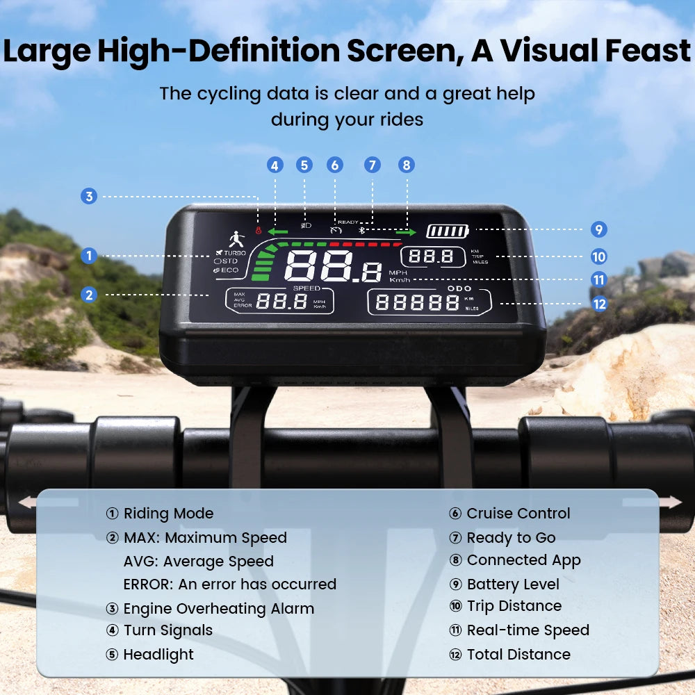 Zeigt anGeschwindigkeit, Batteriestand, Gangmodus, Kilometerstandauf einen Blick